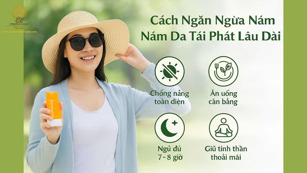 - Kem chống nắng EV Princess SPF cao: Tạo lớp bảo vệ toàn diện trước tia UVA/UVB, ngăn ngừa nám mới hình thành và hạn chế nám tái phát.